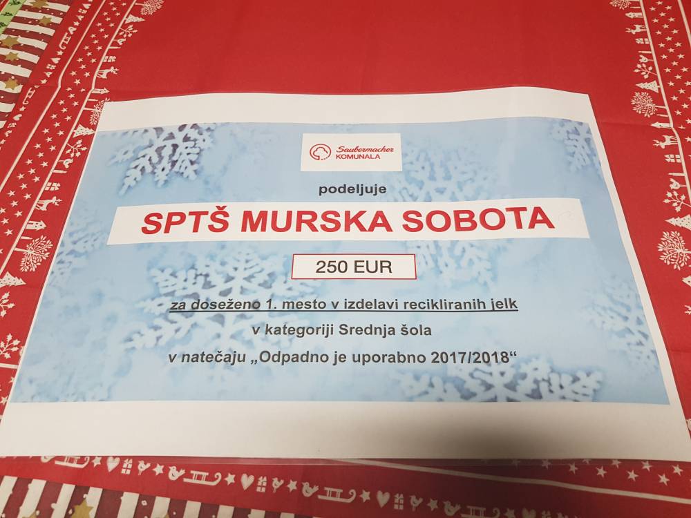 Dijaki SPTŠ so sodelovali v natečaju, ki ga je razpisalo podjetje Saubermacher Komunala iz Murska Sobote. Naloga letošnjega natečaja "Odpadno je uporabno" je bila ustvariti jelko iz recikliranih materialov.