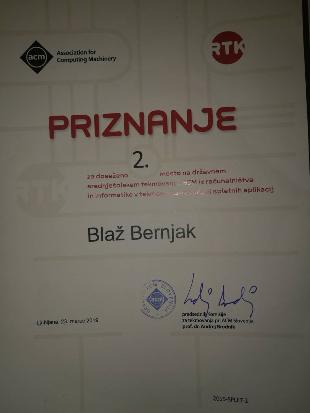 V soboto, 23. marca 2019 je v Ljubljani na Inštitutu Jožefa Stefana in Fakulteti za računalništvo in informatiko potekalo že 14. tekmovanje ACM iz računalništva in informatike. Tekmovanja se je udeležilo veliko dijakov iz naše šole, ki so tekmovali v programiranju in izdelavi spletnih aplikacij. Blaž Bernjak, ki obiskuje 4. letnik programa tehnik računalništva je v tekmovanju v izdelavi spletnih aplikacij osvojil 2. mesto in tako postal državni podprvak v tej kategoriji. Žan Horvat in Denis Prelog, ki sta tekmovala v enaki kategoriji sta se uvrstila na odlično 4. in 5. mesto, oba obiskujeta prav tako 4. letnik programa tehnik računalništva.