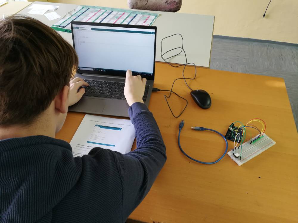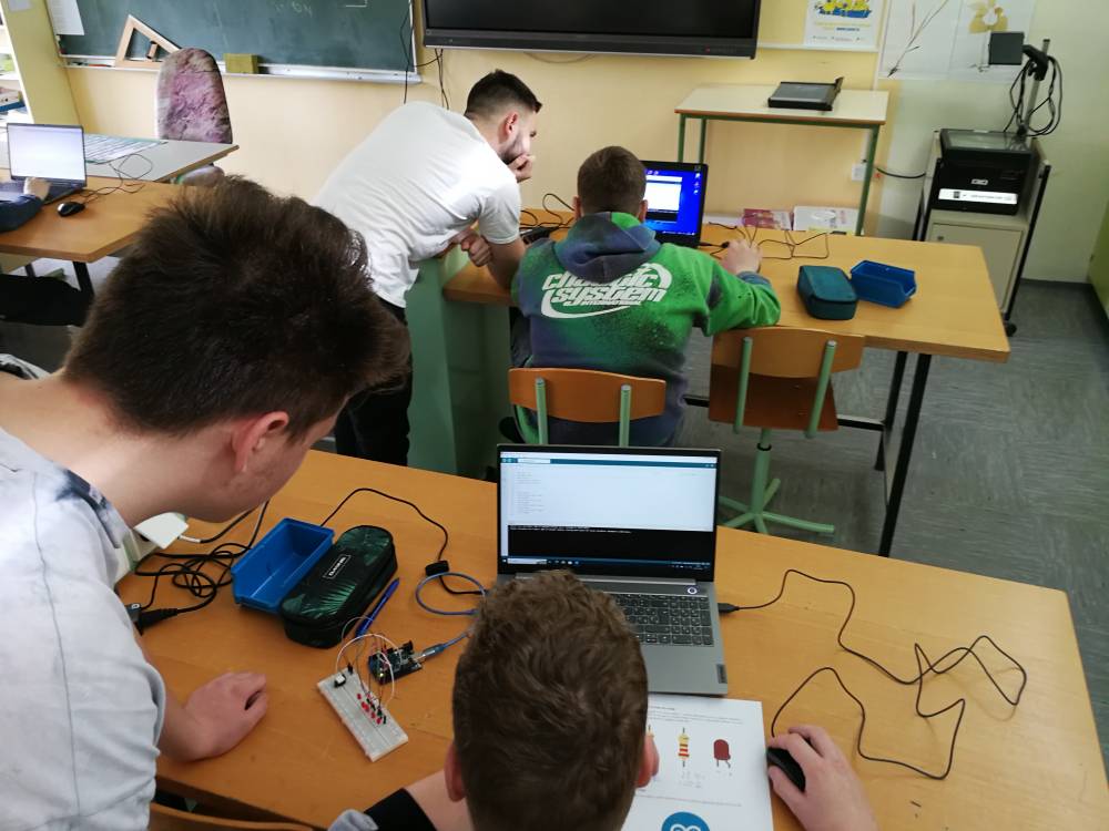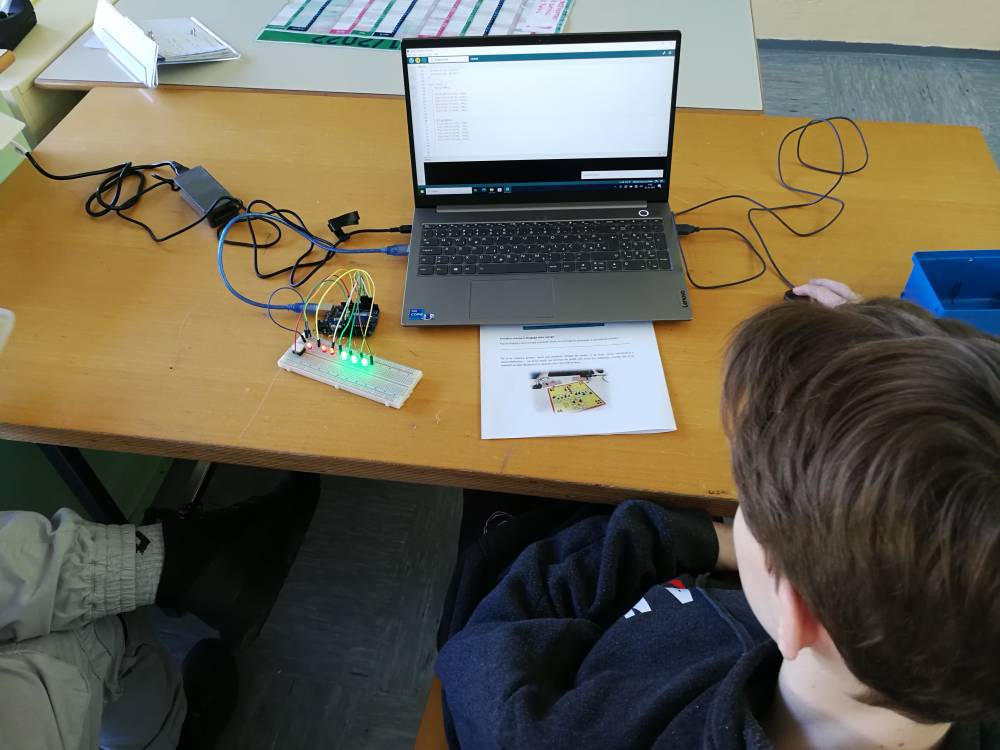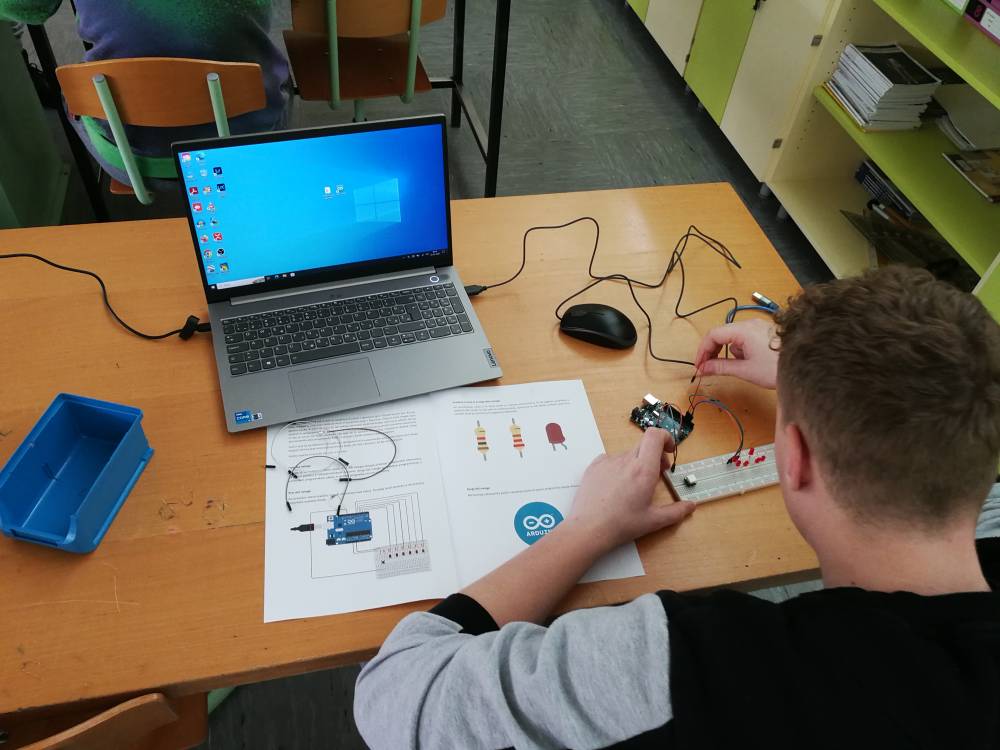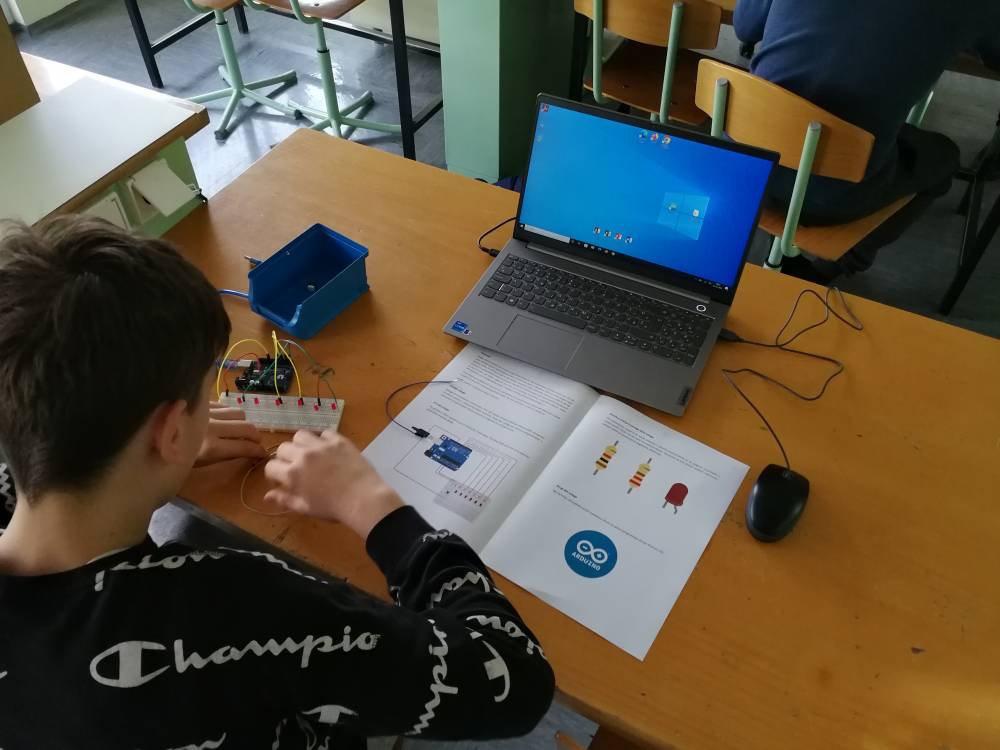 V delavnici s področja elektrotehnike so učenci naredili izdelek - met kocke s pomočjo mikrokrmilnika Arduino. Na začetku delavnice so spoznali osnovne elemente elektronskega vezja, jih ožičili po načrtu ter sprogramirali.