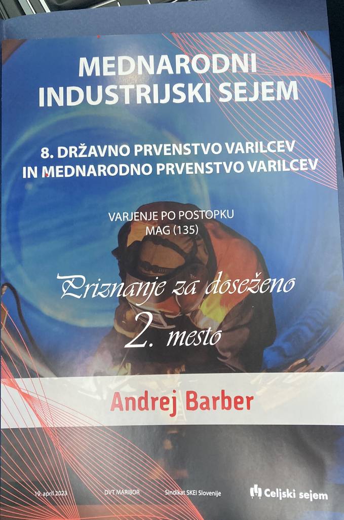 Naš dijak Andrej Barber, ki obiskuje izobraževalni program strojni tehnik (PTI) se je udeležil državnega prvenstva varilcev. V sklopu Mednarodnega industrijskega sejma v Celju, je v sredo, 19. 4. 2023 potekalo 8. državno prvenstvo varilcev.
