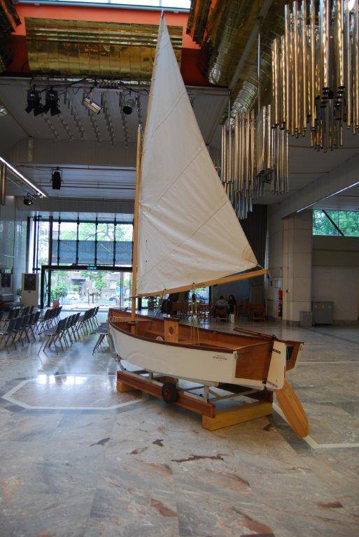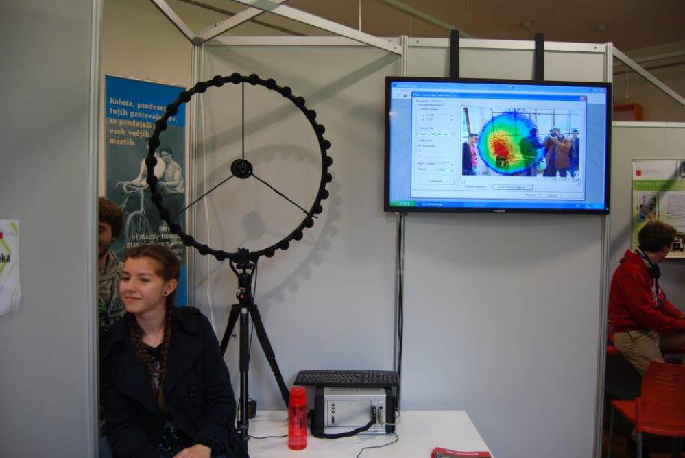 Akustična kamera deluje po enakem principu kot človeško uho. Z njo lahko natančneje določimo lokacijo izvora zvoka oziroma akustične emisije. Namesto ušes uporablja 32 mikrofonov, ki so postavljeni v krožnico. Računalnik s pomočjo algoritma izračunava zakasnitve signalov na posameznih mikrofonih in tako natančno določi izvor zvoka. Lokacija zvoka se glede na jakost zvoka izriše na sliki v obliki barvnih polj. V poskusu bodo obiskovalci lahko «gledali« zvok zvočnikov, piščalk ali pa zvok ploskanja.