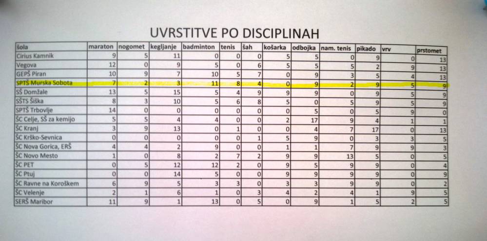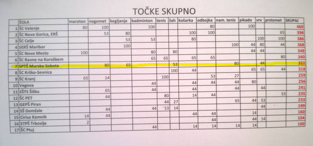 Na športnih tekmovanjih so se letos najvišje uvrstile nogometna in namiznoteniška ekipa (2. mesto), kegljači (3. mesto) in šahisti (4. mesto). Skupno je SPTŠ med 17 sodelujočimi šolami zasedla 7. mesto.