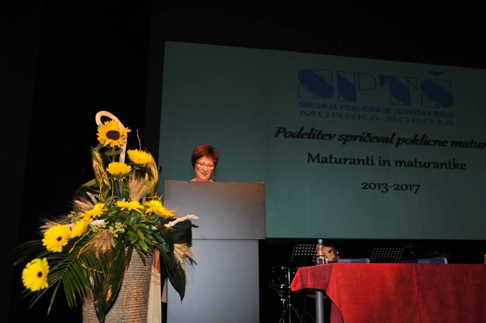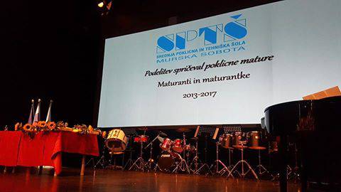 Svečana podelitev spričeval poklicne mature je potekala v sredo, 5. julija 2017 s pričetkom ob 16.00 uri, v Gledališču Park Murska Sobota. Na slavnostni prireditvi so dijaki zaključnih letnikov naše šole prejeli spričevala o poklicni maturi. K poklicni maturi je pristopilo 109 kandidatov, 105 pa jih je bilo uspešnih. Enajst dijakov je prejelo naziv zlati maturant in od tega so trije dijaki prejeli naziv diamantni maturant, kar pomeni, da so na poklicni maturi osvojili vse možne točke (triindvajset).