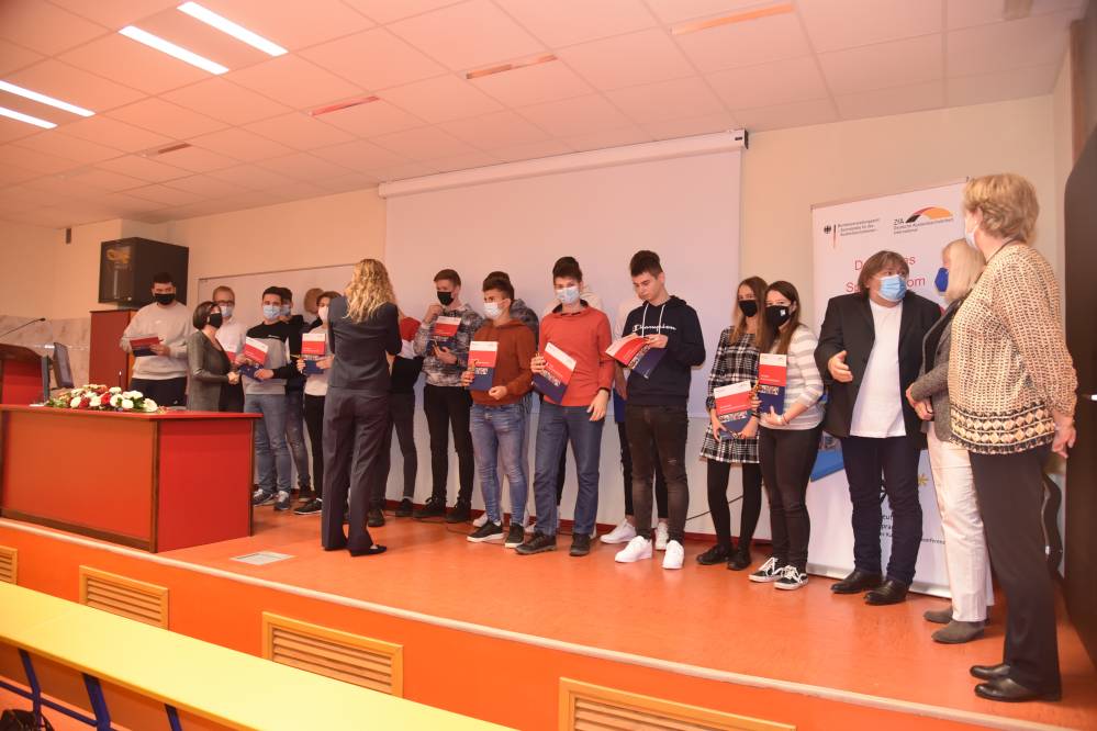Na svečani podelitvi so se nam pridružile gospa Natalie Kauther, veleposlanica Zvezne republike Nemčije v Sloveniji, gospa Birgit Bader, strokovna svetovalka za nemški jezik v Ljubljani in pristojna za Nemško jezikovno diplomo, ter gospa Eva Grešak z nemškega veleposlaništva. Veleposlanica je v nagovoru poudarila pomen učenja in znanja nemščine ter pohvalila rezultate naših dijakov. Gospa Birgit Bader je povedala, da so naši dijaki v teh izjemnih okoliščinah ponovno dosegli izvrstne rezultate.
