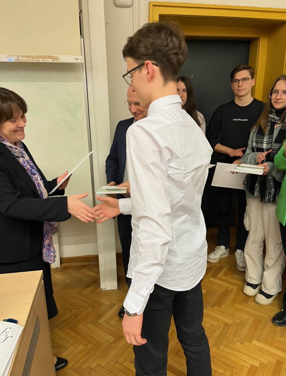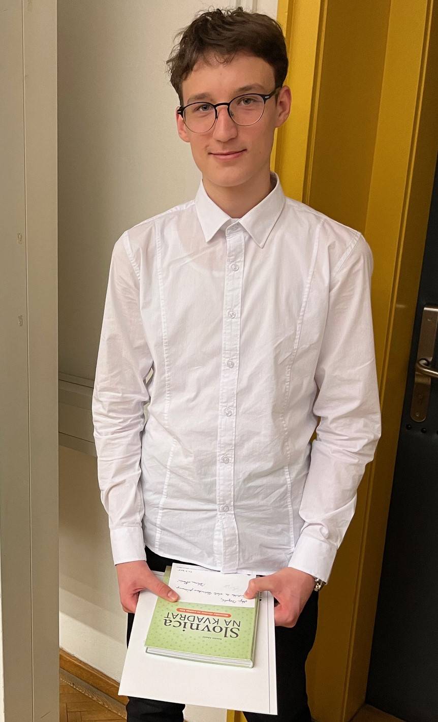 V petek, 21. marca, je na Filozofski fakulteti v Ljubljani potekalo sklepno dejanje letošnjega tekmovanja iz slovenskega jezika za Vodnikovo priznanje – podelitev priznanj. V kategoriji srednjih strokovnih šol so podelili eno zlato in štiri srebrna Vodnikova priznanja. Zlato priznanje je iz rok predsednice Slavističnega društva Slovenije dr. Jožice Jožef Beg prejel dijak oddelka 3K1 Nejc Irgolič.